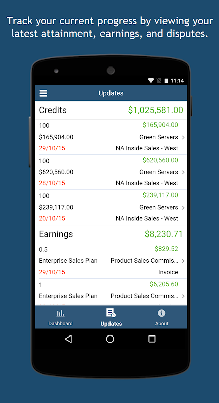 Sales people are able to view real time compensation data processed within the application. The Mobile Commissions application provides details from the last pay period such as payments (both commissions and bonus), payment balances, credit attainment, earnings, and performance. Sales people can also track their progress for the current period by viewing their latest credit attainment, earnings, and any payments processed to date.