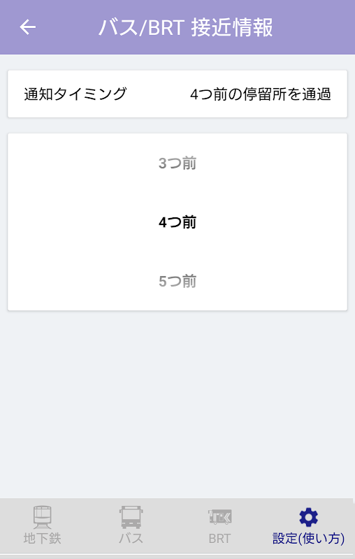 - Het initiële bovenste scherm op het moment van installatie is de metro, maar de functies (metro, bus, BRT en instellingen (hoe te gebruiken)) op het moment dat u de app afsluit, zullen het bovenste scherm zijn de volgende keer dat u de app start app.