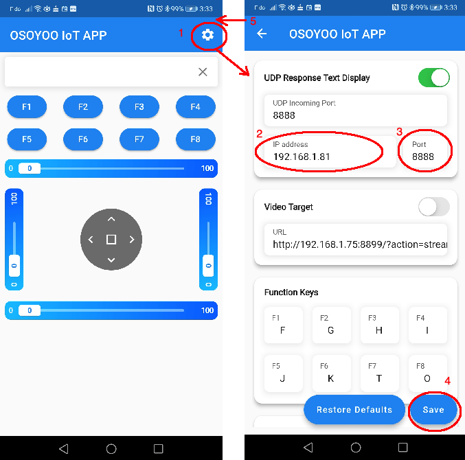 OSOYOO IoT UDP Robot APP is ontworpen om UDP-gegevens te verzenden/ontvangen van/naar OSOYOO Robot Cars en OSOYOO IoT SmartHome-apparaten. Het kan ook een http-videostream van de robotcamera krijgen en deze gebruiken om de beweging van de robotauto te besturen.