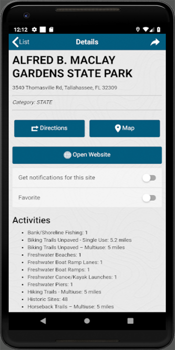 Outdoor Florida is your source for finding available recreational opportunities across Florida’s diverse public lands system. From camping, to boating, to hiking and biking, there are opportunities are around every corner in Florida. With this simple application, find an experience that is perfect for you with searches based on desired activity and location. Be sure to enable location tracking to receive features like Florida state park event notifications and geo-located messages when near designated points of interest. Granting certain app rights may enable access to future enhancements such as social media, photo sharing, and gamification. Outdoor Florida was created by the Florida Department of Environmental Protection (DEP) to fulfill Florida Legislation that took effect July 1, 2016 to further increase public awareness of recreational opportunities available to the public on Florida’s conservation lands.