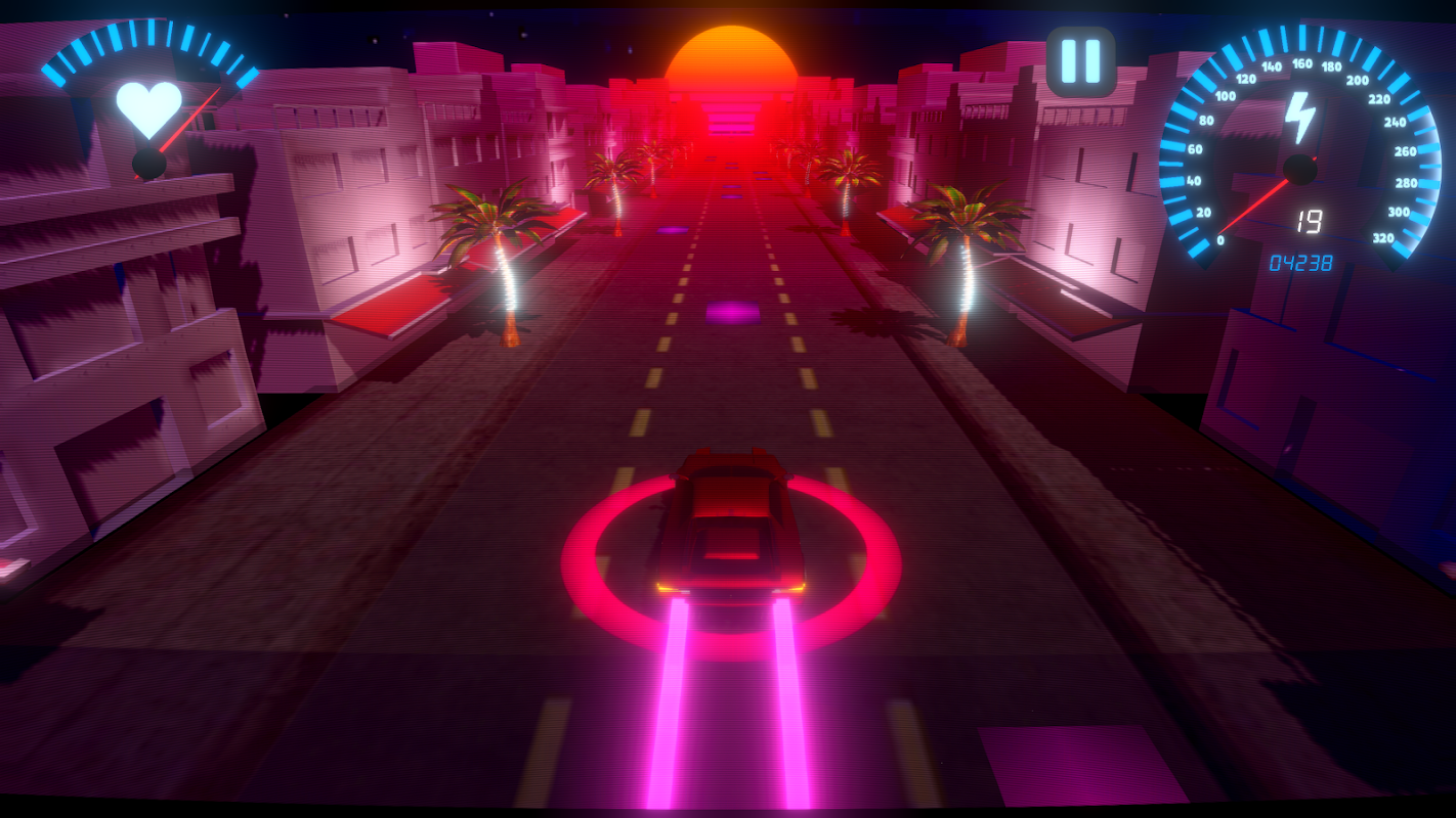 Overdrive is a high powered rhythm game. Take an 80’s themed joyride down the retro neon Miami scene, as you cruise along to the beat. Swerve between lanes to keep up with the music and avoid hazards as you become more engrossed. Tune in to an original soundtrack and watch the scene transform in front of you. Each song affects the speed and visuals of the environment. Buildings begin to bounce and the sun starts to pulsate to the rhythm of the music