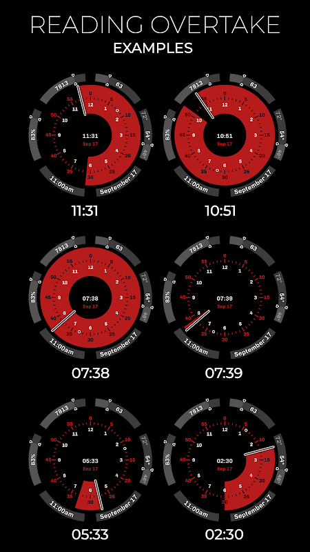 Overtake biedt een strakke, moderne benadering van de wijzerplaat, geïnspireerd op het strakke ontwerp van autodashboards. Het combineert een datarijk display met een onderscheidende manier om de tijd weer te geven.