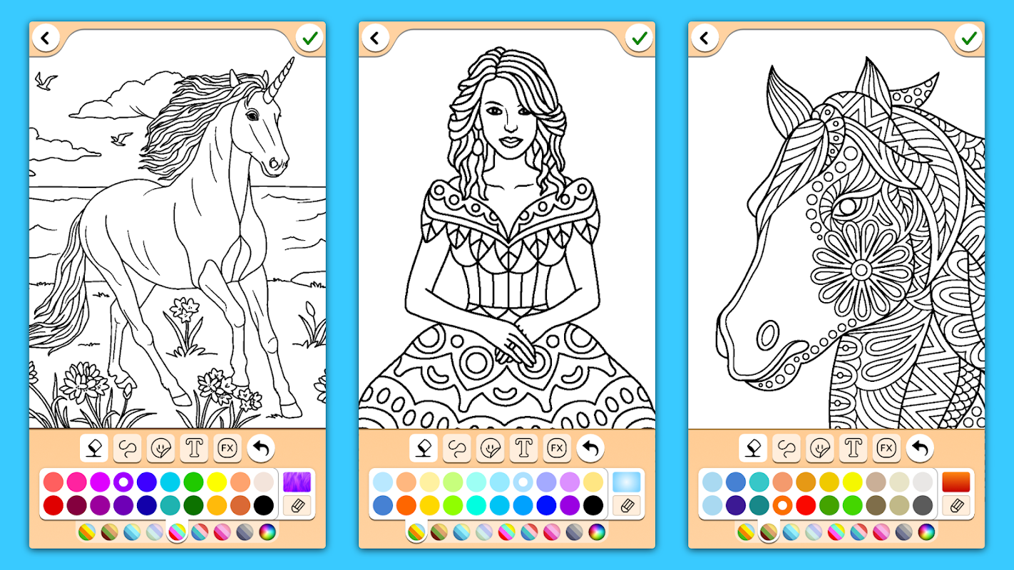 Het brede scala aan kleurontwerpen en tekengereedschappen is leuk en gemakkelijk te gebruiken voor een gemengd publiek van alle leeftijden. Het bevat ook een heleboel kleurplaten voor volwassenen.