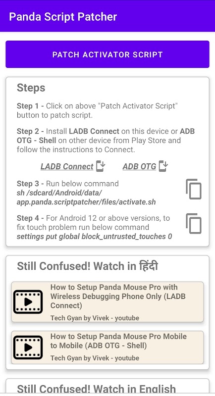 Het doel van deze app is om activeringsondersteuning te bieden voor "Mouse Pro" en "Gamepad Pro" via draadloze foutopsporing (alleen telefoon) en via een andere mobiel in alle Android-versies.