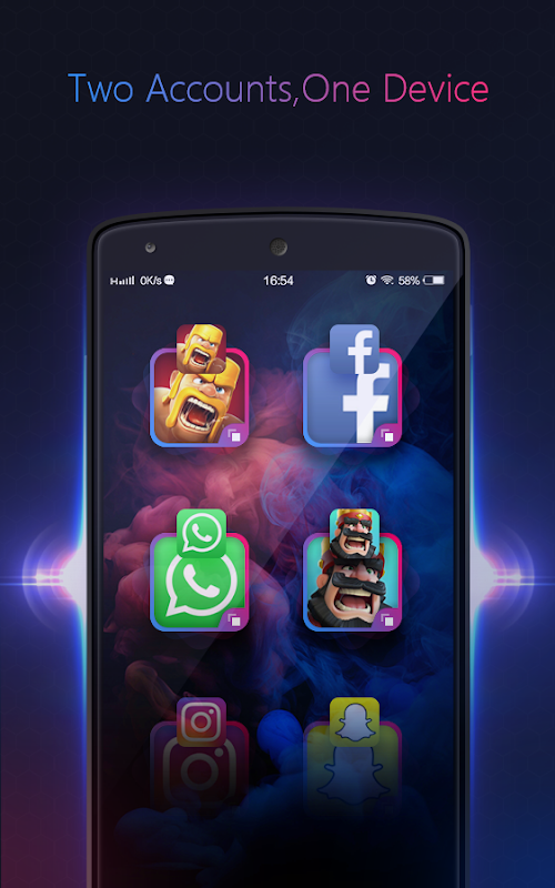 Established on virtualization engine technology, Parallel Box makes it easy to create cloned apps which can run in parallel and work independently from their original apps. If you need to separate your personal life from work, you can just do it easily by using multiple logins for apps like Facebook, WhatsApp, Instagram, Snapchat, and Messenger. If you want to upgrade your game accounts faster or simply double your gaming experience, you can run multiple accounts on Clash of Clans, Clash Royale, or Game of War. Adding and switching between multiple accounts is that easy!
