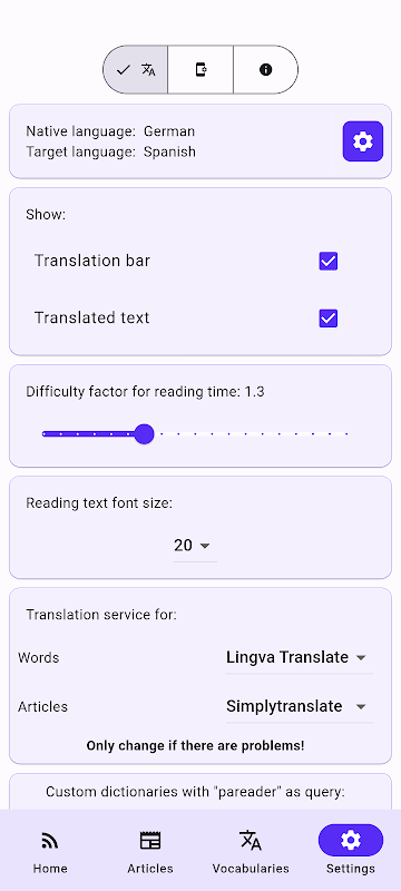 Dompel jezelf onder in het leren van talen met Parareader. Met deze innovatieve app kunt u teksten naast elkaar lezen in uw doeltaal en uw moedertaal, waardoor het begrip eenvoudiger en intuïtiever wordt. Vertaal onbekende woorden ter plekke en exporteer hele zinnen en woordenschat rechtstreeks naar Anki. Verbeter uw studiesessies met op maat gemaakte flashcards, zodat u nieuwe woorden en zinsneden effectief kunt onthouden en beheersen. Parareader transformeert lezen in een interactieve en krachtige taalleerervaring.