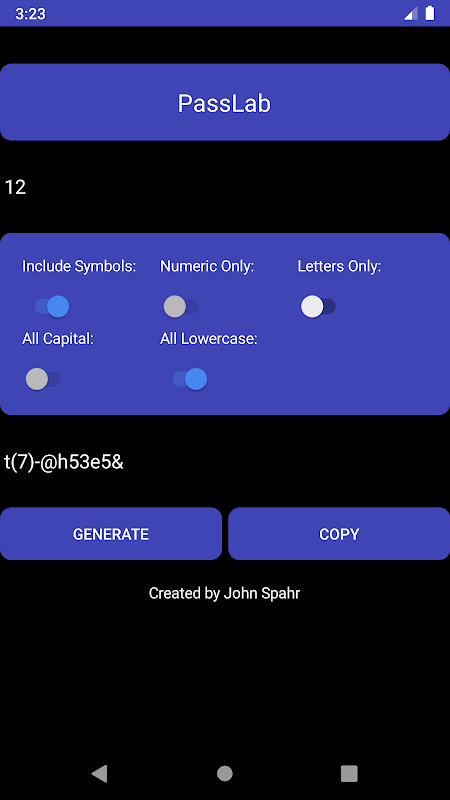 PassLab is an app that creates passwords for you. It offers many premium features for free, such as advanced password customization options. Better yet, PassLab does not have any ads or in-app purchases. PassLab features a beautiful dark theme and user interface, making generating passwords a breeze! If you want to create strong passwords without complications, you'll love PassLab.