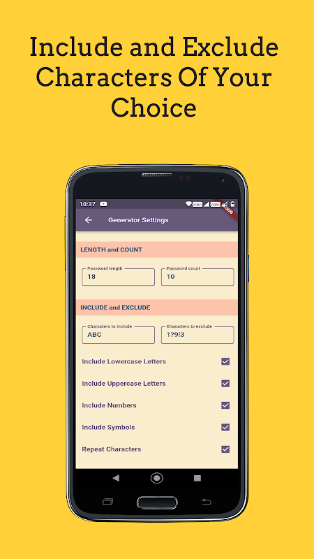 Om te voldoen aan de vereisten van verschillende platforms of persoonlijke voorkeuren, stelt de app u in staat om specifieke tekens in uw wachtwoorden op te nemen of uit te sluiten. U kunt ervoor kiezen om hoofdletters, kleine letters, cijfers en speciale tekens op te nemen, of een van deze uit te sluiten op basis van uw behoeften om wachtwoorden te genereren.