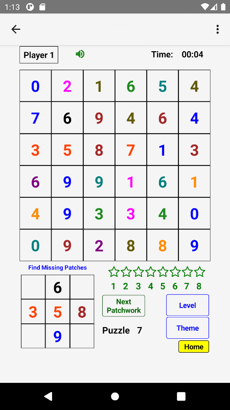Er zijn drie moeilijkheidsgraden ingebouwd in de app. Niveau 1 gebruikt een grote 6 x 6 Crazy Quilt, waardoor het relatief eenvoudig is om het [3x3] patchworkpatroon te matchen. Niveau 2 gebruikt een 8 x 8 Crazy Quilt; Niveau 3 gebruikt een quilt van 10 x 10. De hogere niveaus vertegenwoordigen niet noodzakelijkerwijs een hogere moeilijkheidsgraad, maar het zal waarschijnlijk iets langer duren om het patroon te vinden. De grootte van het [3x3] patchwork is op alle niveaus hetzelfde.