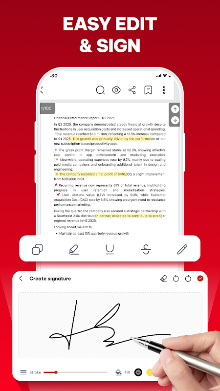 Verbeter uw PDF met tools waarmee u direct in het document kunt markeren, tekenen en opmerkingen kunt plaatsen, wat de duidelijkheid en samenwerking met PDF Reader verbetert.