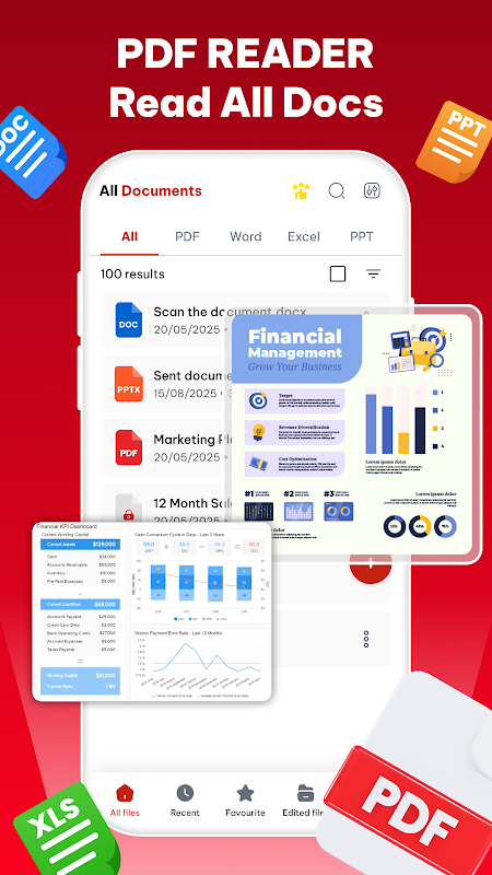 Lees al uw Office-documenten naadloos. Document Reader: PDF Viewer ondersteunt 4 belangrijke Office-formaten, zodat u nooit essentiële informatie mist, of het nu een DOCX of een PPT is.