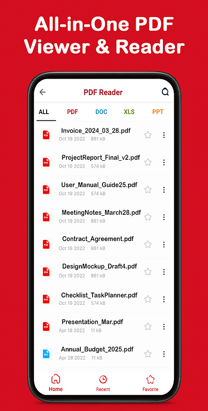 PDF Reader All Document Editor is jouw ultieme alles-in-één kantooroplossing. Deze lichtgewicht app is perfect compatibel met alle Office-bestanden en helpt je eenvoudig documenten in alle formaten te verwerken, zoals PDF, DOC, DOCX, XLS, XLSX, PPT en TXT. De app scant automatisch je apparaat om bestanden in mappen te ordenen, zodat je ze direct kunt zoeken en bekijken.