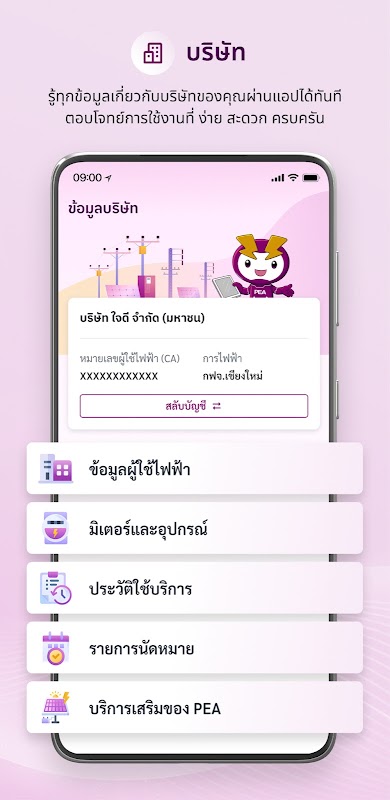 PEA Privilege mobiele applicatie is een applicatie die alleen bedoeld is voor klanten in de businessgroepen van de Provinciale Elektriciteitsautoriteit. Ter ondersteuning van het creëren van een gebruikerservaring en tevens dienen als kanaal voor het opbouwen van goede relaties tussen klanten en medewerkers. Het ondersteunt ook de toegang tot verschillende informatie. Absoluut belangrijke klantinformatie De applicatie heeft vele functies: