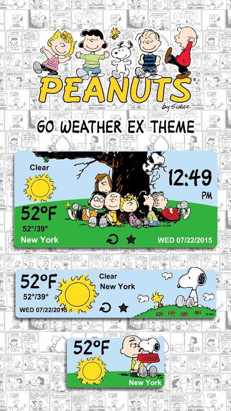 Peanuts (Snoopy) GO Weer widget thema. Ondersteunt 4 * 1, 4 * 2, 2 * 1 maten.
