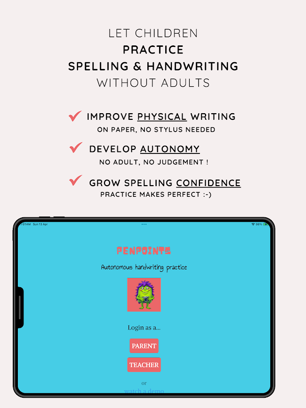 PenPoints is ontworpen voor jonge leerlingen op de basisschool (van 6 tot 12 jaar oud) en maakt het oefenen van fysiek ‘pen en papier’-handschrift mogelijk, waarbij AI wordt gebruikt om woordenlijsten te dicteren en direct feedback te geven op basis van een foto van handgeschreven woorden.