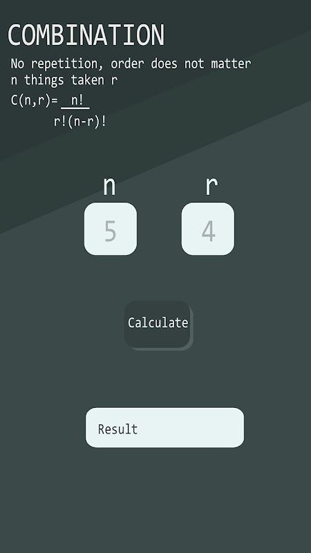 Verkrijg het resultaat van de berekening van de permutatie, cyclische permutatie, combinatie en multiset. Voer gewoon n en r in en verkrijg met één aanraking het resultaat.