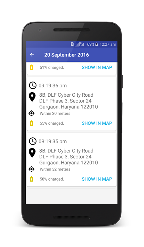 * Keeps history of tracked locations by datewise,monthwise and yearwise for unlimited time(Till user deletes it).