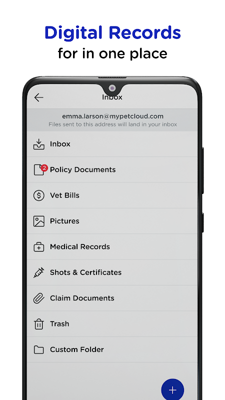 Inbox en documenten: maak mappen voor medische dossiers, adoptiedossiers, dierenartsrekeningen, foto's en maak gepersonaliseerde mappen. Vooral handig tijdens een noodsituatie met uw huisdier: toegang tot al uw gegevens waar en wanneer u ze nodig heeft; en upload en deel documenten met iedereen.