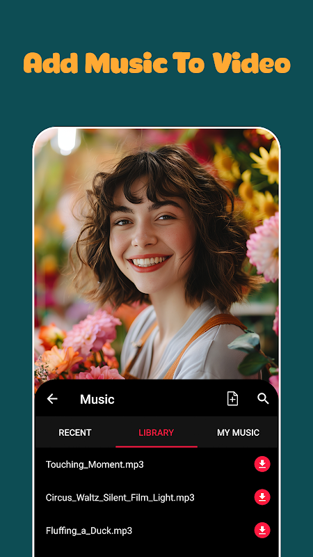 Vriendelijke en eenvoudig te gebruiken interface, je kunt muziek uit onze audiobibliotheek selecteren om fotovideo's met muziek te maken, waardoor je video's tot leven komen.