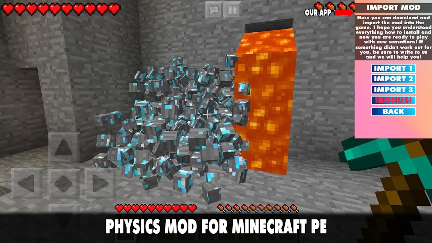 😀🤣If you are tired of the regular version of Minecraft and want to diversify the gameplay, you can install one of our modifications. This is what we talked about above. But this will not be an ordinary addition that adds fabulous animals, new locations or props, but a unique mods. You can download the always updated Physics Mod for Minecraft Pocket Edition 2022!🤣😀
