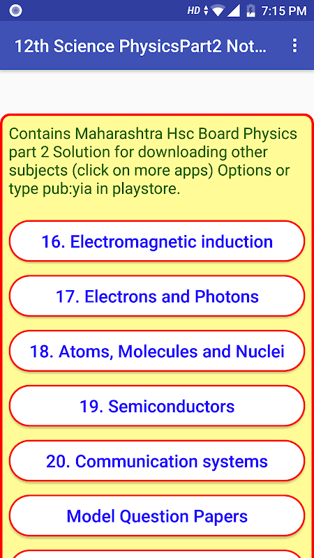 This Android App Brings you 12th Science Physics Part 2 Solution, notes and old papers Maharashtra hsc board. you will find chapter wise solutions and important questions and answers. The app contains following chapter of 12th Science physics part 2 :-