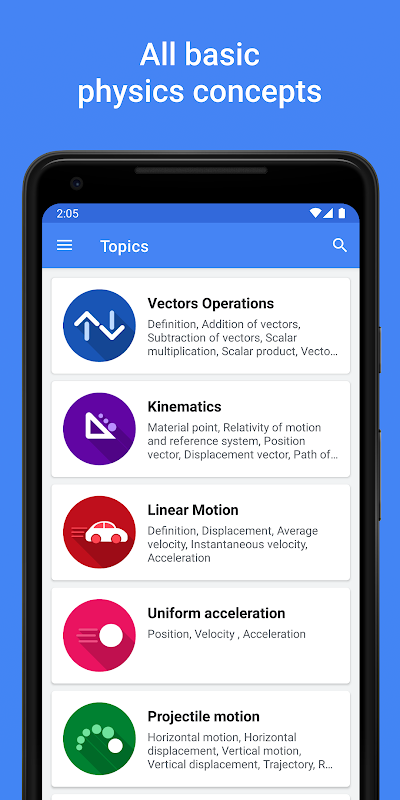 Bevat meer dan 25 meest vitale en fundamentele natuurkundige concepten. Elk onderwerp krijgt een korte inleiding op het concept en wordt gevisualiseerd met een mooi icoon. En we nemen elementaire wiskunde op voor herziening en als referentie. Elke eenheid bevat formule, vergelijkingen en gedetailleerde beschrijving die zijn opgemaakt voor alle niveaus van natuurkunde, van basisschool tot universiteit.