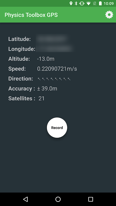 This sensor app measures and displays latitude, longitude, altitude, speed, and direction, with +/- accuracy and number of satellites.