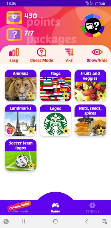 Foto raadspel. Verschillende afbeeldingscategorieën en spelmodi