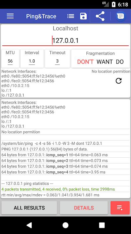 Deze applicatie gebruikt de "ping"-opdracht van het systeem. Met deze app kun je opdrachten uitvoeren, niet alleen met dezelfde parameters, maar ook met verschillende MTU (bereik) of verschillende TTL (bereik van 1 tot 30).