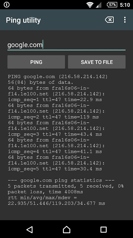 Ping is een netwerk hulpprogramma waarmee u kunt controleren of een bepaalde host bereikbaar is of niet, het verzenden van een reeks van ICMP pakketten en het meten responstijden van de gastheer. Deze app kun je snel en gemakkelijk gebruik maken van de functie Ping, en de resultaten exporteren naar een tekstbestand. U kunt de bestemming op te geven met behulp van zowel IPv4-adres als de DNS-naam. De output toont ook de statistieken over responstijden: minimum, maximum, gemiddelde en standaarddeviatie.