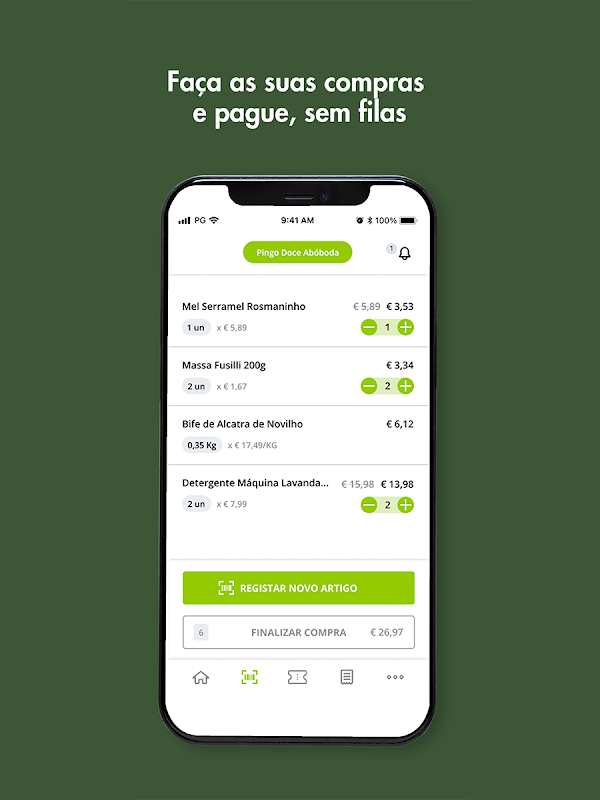Maak gebruik van de Scan&Go-optie en creëer uw virtuele winkelwagen door de barcode te scannen van de artikelen die u wilt meenemen. Aan het einde kunt u betalen bij een exclusieve box, naast de self-checkouts. Koppel uw O Meu Pingo Doce-klantnummer en krijg toegang tot de gebruikelijke voordelen.