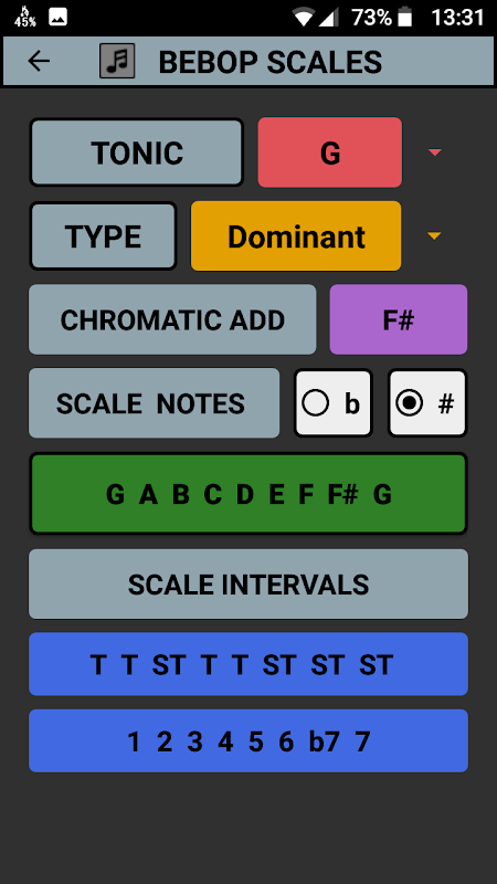 Selecteer een tonisch en een bebop-schaaltype. De app toont de noten van de schaal en de toegevoegde chromatische noot.