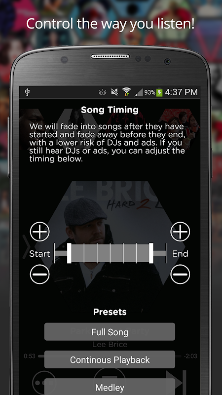 Plaze enables you to enjoy the best commercial-free music experience for free. Simply select the genre(s) of music that you want to listen to and we'll do the rest! Custom timing controls enables Plaze to deliver a unique and customizable stream of music - hassle free and without interruptions. If you don't like what you're hearing, tap the skip button for something else. You can also favorite and view your recently played songs.