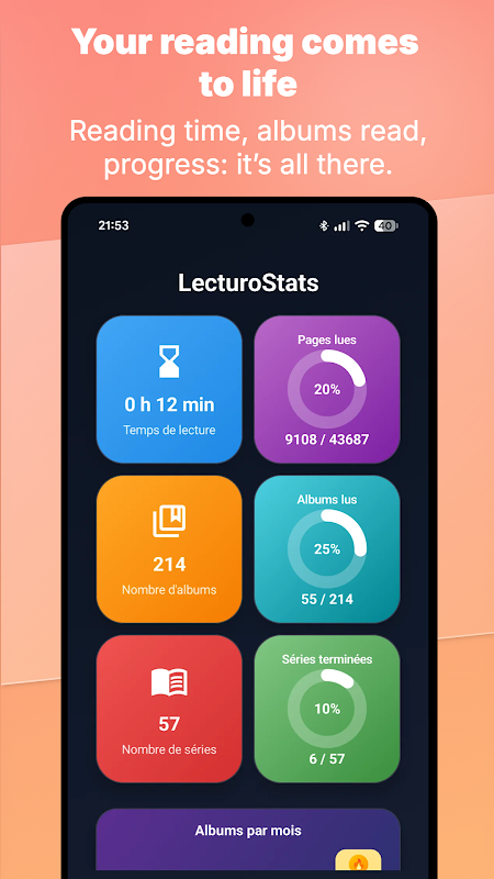 Houd je leestijd, voltooide albums en voortgang in series bij.
