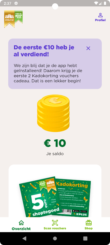 Met de PLUS Kadokorting app scan je direct de verkregen vouchers en komt het gespaarde saldo in je