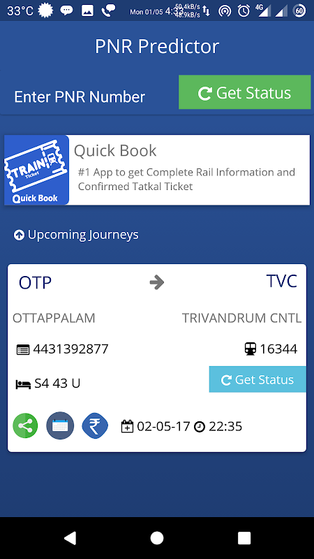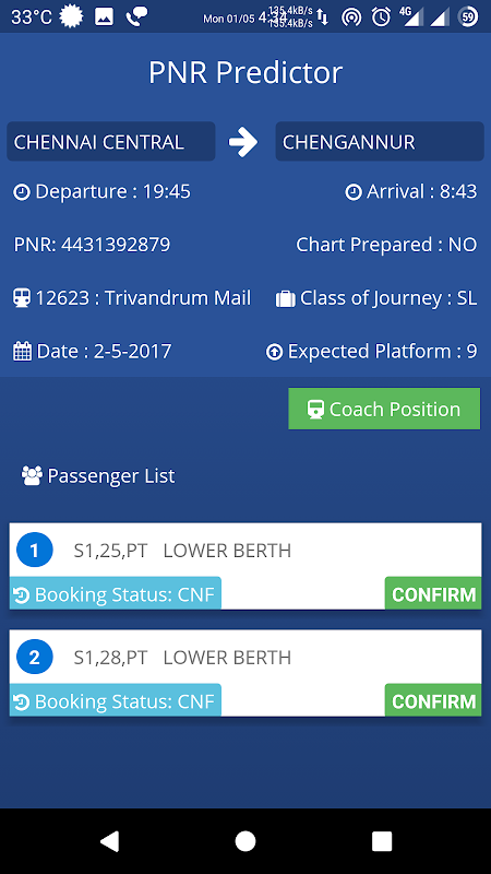 Get PNR Status with Complete Information , Chances for Confirmation if ticket is waitlisted, Coach Position for easier boarding of trains.