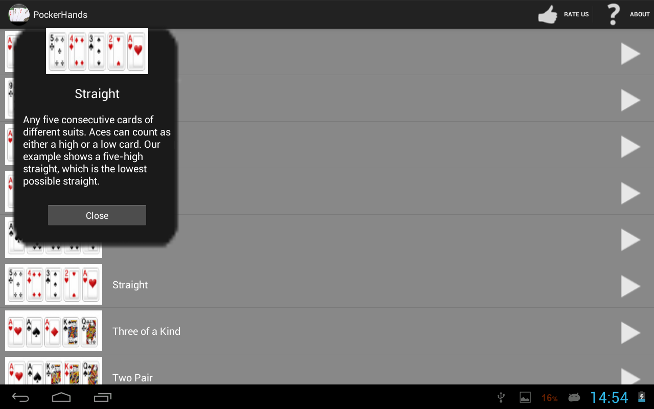 Deze applicatie geeft informatie over alle mogelijke handen. Als je begint poker, zal deze applicatie helpt u om kennis te verwerven.