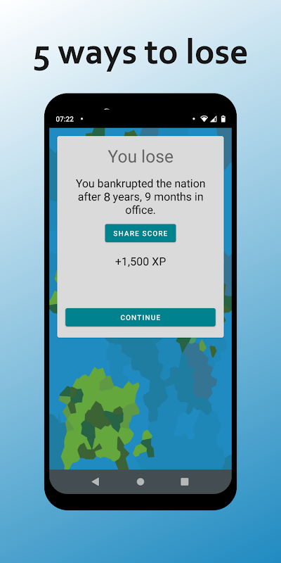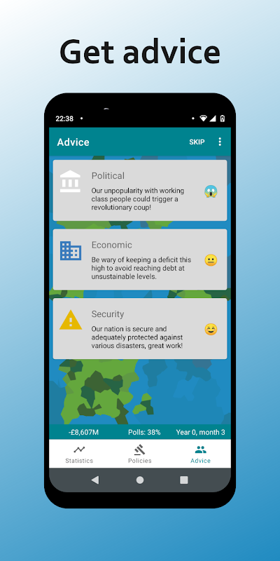 • Meerdere eindes: Navigeer door de politieke omgeving met het risico te verliezen door een verkiezingsnederlaag, faillissement, revolutie, partijstaatsgreep of invasie. Elke uitkomst weerspiegelt de diepgang van uw strategische keuzes in dit overheidsspel.