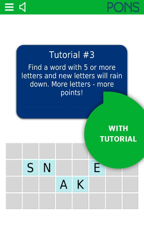 Of je nu in een trein zit, wacht tot de verkeerslichten groen worden of thuis op de bank luiert, je kunt de woord-app PONS SpellFlash gebruiken om je woordenschat te leren en er tegelijkertijd plezier aan te beleven. Het doel van de game is om de langst mogelijke woorden te vormen uit een verzameling letters. Hoe langer het woord oproept, hoe hoger het aantal behaalde punten. De intelligente slimme modus maakt het mogelijk om woorden snel en eenvoudig te ontdekken en hun betekenis op te zoeken. Vind woorden, verzamel punten en behaal de hoogste score!