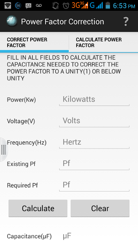 This simple app calculates the capacitance required to correct a given power factor in a 3 phase electrical circuit to unity (1) or to a point below unity.Thus improving the efficiency of that electrical circuit.It also includes a calculator to calculate true power, apparent power or power factor