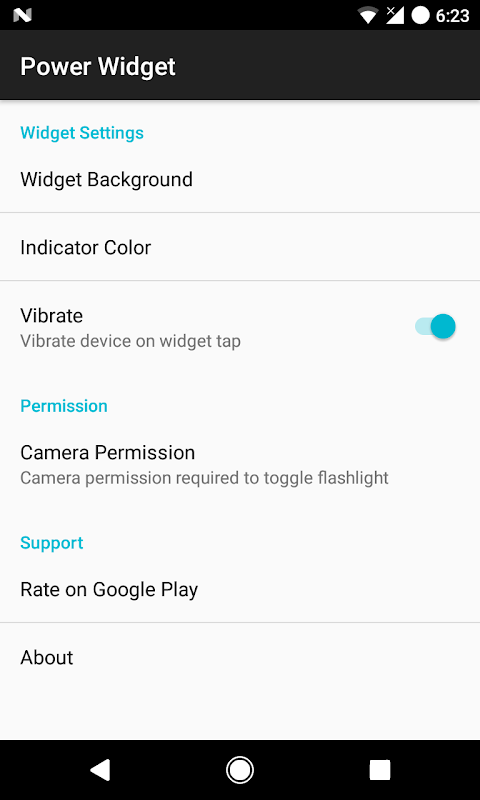 An elegant Power Widget for quick access to useful settings. Toggle Wifi, Bluetooth, Location, Flashlight and Ringer easily.