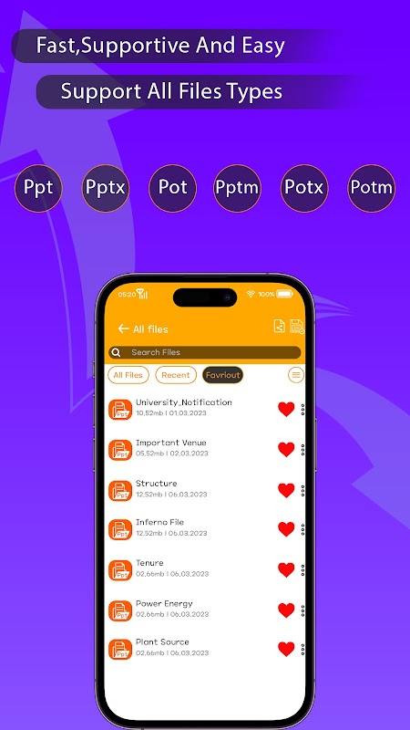 PPTX-bestandsopener en PPTX-viewer geven u al uw pptx-bestanden op één plaats, zodat het zo gemakkelijk wordt om uw ppt-bestanden te vinden, dat is heel gemakkelijk en plezierig. voltooi alle dia's van pptx-bestanden die moeten worden geopend in de telefoon. u hoeft uw laptop niet mee te nemen voor ppt-bestanden en pptx-viewer die op uw telefoon wordt geopend.