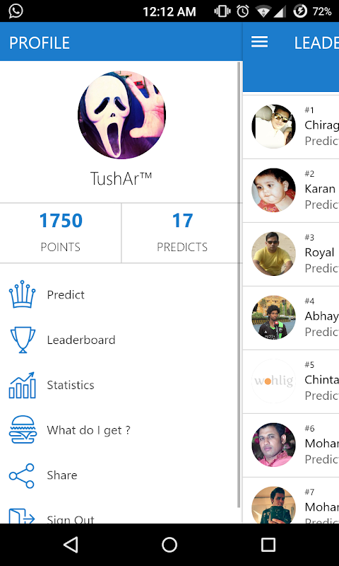 The home page of the application consist of the matches which are to be played. To predict, one needs to click on the team which they are supporting and click on the 'predict' button shown below the team name. The menu also consists of various features like the leader board, statistic and what do i get options.