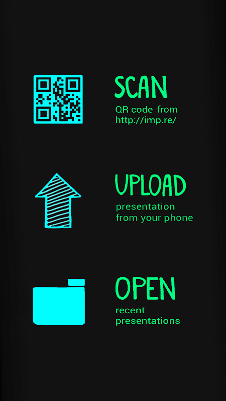 - Upload from computer: open http://imp.re/ on the computer, upload your presentation and scan QR code from the screen using our app;