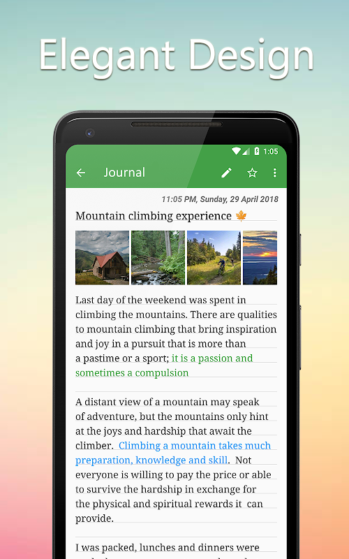 Private Journal comes with inbuild lock containing pin/password/pattern & fingerprint lock options. You can always be safe of the journal you write in it. With backup & restore feature you can never lose the data when you migrate to other devices. Colorful themes & night mode is present to make the app customizable to your taste.