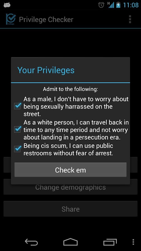 Check your privilege, with PrivilegeChecker. The Android app that helps to keep you from inadvertently oppressing those around you. This app with its patented OppressionMeter™ can tell you just how oppressive you are being by simply existing! This app does not have any ADs, nor does it require Internet access. In fact, it doesn't request any special privileges at all. Thats because here at PrivilegeChecker, "We do our best to never oppress!"
