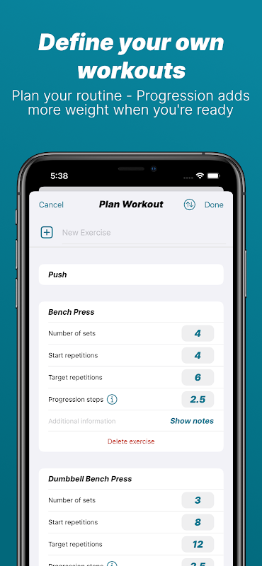 Word sterker met Progression door je te helpen je prestaties te verbeteren. De intensiteit van de oefeningen zal automatisch toenemen in de volgende workout, nadat u uw vooraf gedefinieerde aantal maximale herhalingen heeft bereikt.