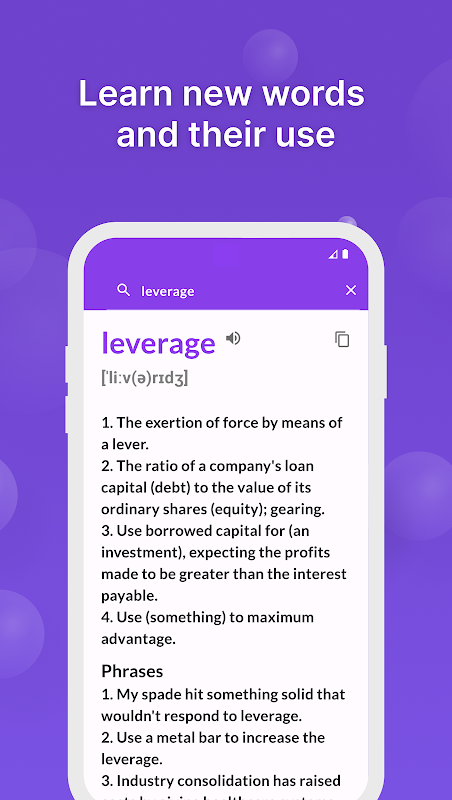 • Woordenboek – Toegang tot definities met voorbeeldzinnen om nieuwe woorden en hun gebruik te leren.