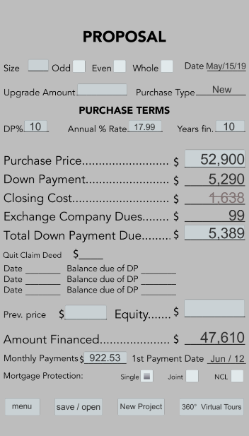 Met Proposal Pro kunt u uw potentiële klanten de waarde laten zien van het onroerend goed dat u verkoopt, de initiële aanbetaling en de maandelijkse betaling op basis van de industriestandaarden. (0%, 9,99%, 12,99% en 17,99%) . Wijzig het aantal gefinancierde jaren van 1 naar 10. Voeg hypotheekbescherming, sluitingskosten of kosten voor wisselbedrijven toe of verwijder deze.