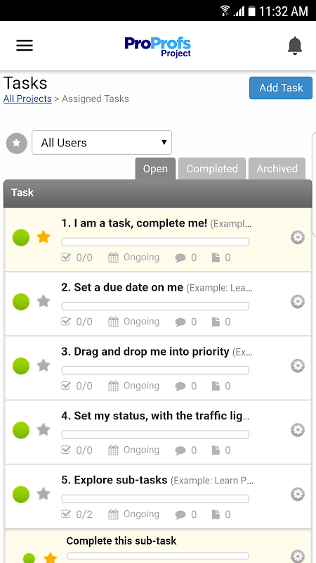 De ProProfs Project Android-app neemt het beste van onze web-versie en kunt u uw projecten op de verhuizing te beheren. Track vooruitgang, taken delegeren, toegang tot rapporten en nog veel meer, zelfs terwijl u niet op kantoor bent.